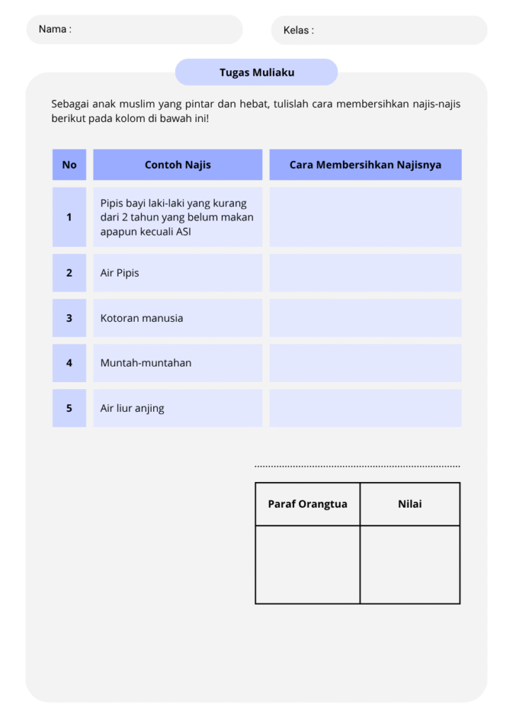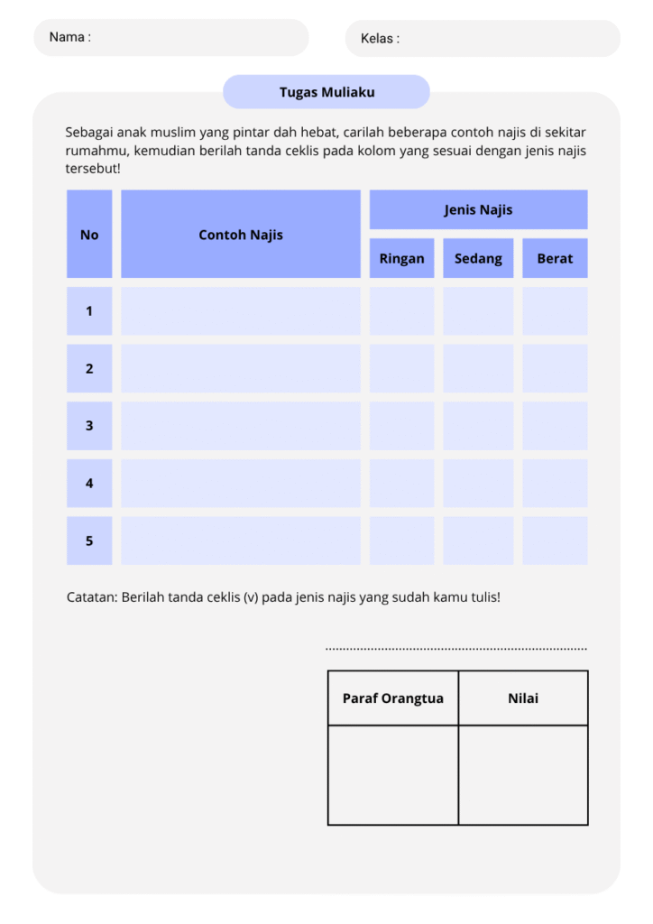 Mengajarkan anak tentang ilmu fiqih sejak dini sangat penting, terutama mengenai thaharah (bersuci) yang menjadi dasar kebersihan dalam Islam. Kini, hadir template lembar kerja Canva berjudul “Macam-Macam Najis – Lembar Kerja Abu-Abu Biru Sederhana” yang dirancang khusus untuk anak-anak muslim agar mereka bisa belajar mengenal jenis-jenis najis secara mudah, praktis, dan menyenangkan.