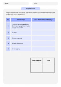 Macam-Macam Najis (Lembar Kerja) Template Macam-Macam Najis ini merupakan template lembar kerja peserta didik untuk kelas SD. Jumlah total halamannya: 3 halaman. Mengajarkan anak tentang ilmu fiqih sejak dini sangat penting, terutama mengenai thaharah (bersuci) yang menjadi dasar kebersihan dalam Islam. Kini, hadir template lembar kerja Canva berjudul “Macam-Macam Najis – Lembar Kerja Abu-Abu Biru